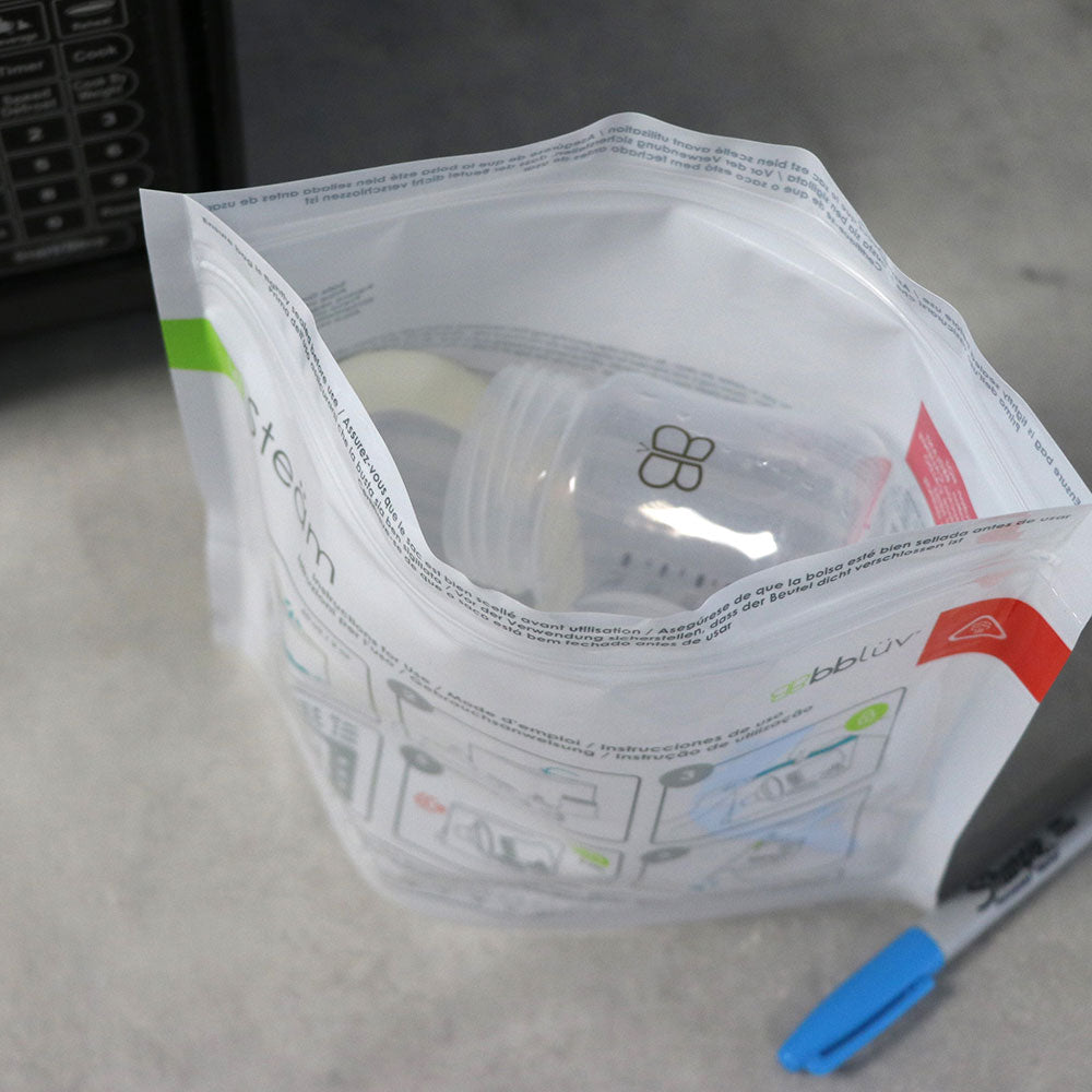 Το Steam κάνει την αποστείρωση απλή, γρήγορη και απόλυτα πρακτική. Είτε θέλετε να αποστειρώσετε μπιμπερό, θηλές, πιπίλες, εξαρτήματα θηλάστρου ή άλλα αξεσουάρ της bbluv, οι σακούλες αποστείρωσης μικροκυμάτων Quick-Steam εξουδετερώνουν βακτήρια και μικρόβια σε λίγα μόλις λεπτά! Κάθε σετ περιλαμβάνει 6 σακούλες, καθεμία εκ των οποίων μπορεί να χρησιμοποιηθεί έως και 20 φορές, προσφέροντας συνολικά 120 κύκλους αποστείρωσης. Οι οδηγίες χρήσης είναι τυπωμένες επάνω σε κάθε σακούλα για μέγιστη ευκολία.