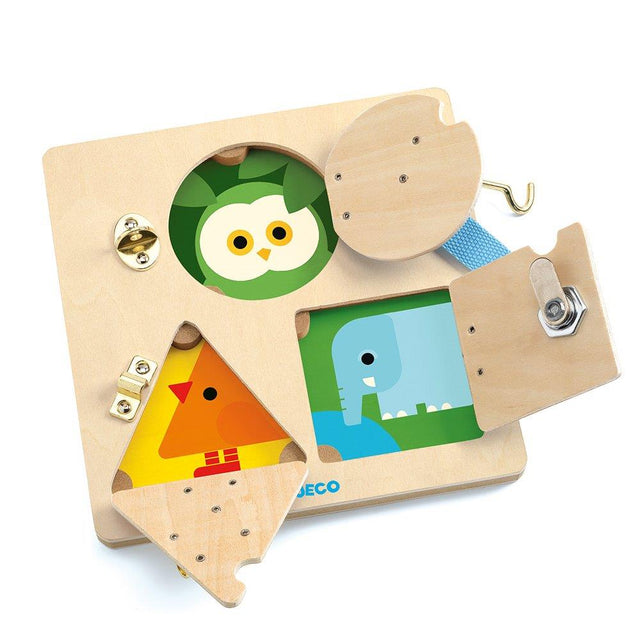 Djeco εκπαιδευτικό Παιχνίδι 'Μαθαίνω να ανοιγοκλείνω κλειδαριές Ζωάκια' για λεπτη κινητικότητα και ανακάλυψη.