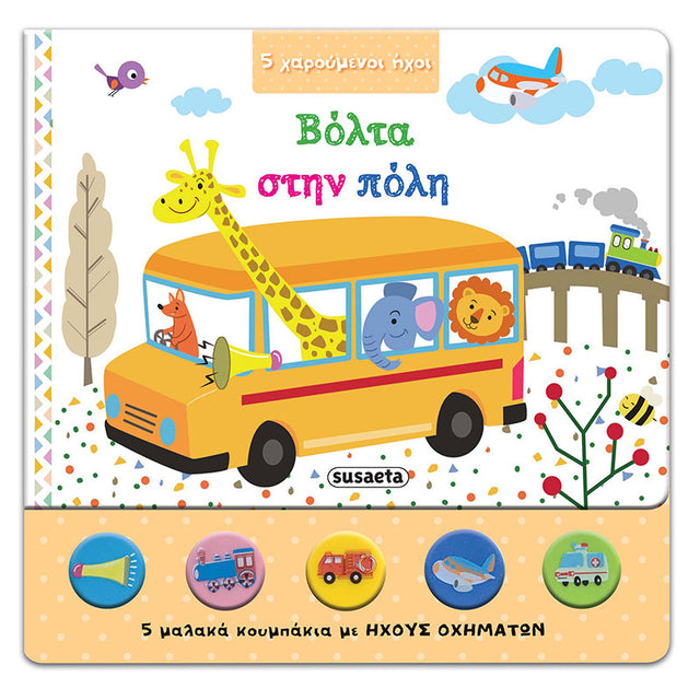 Βόλτα στην Πόλη (Με ήχους). Βιβλίο από χαρτόνι και μαλακά κουμπιά με ήχους οχημάτων.