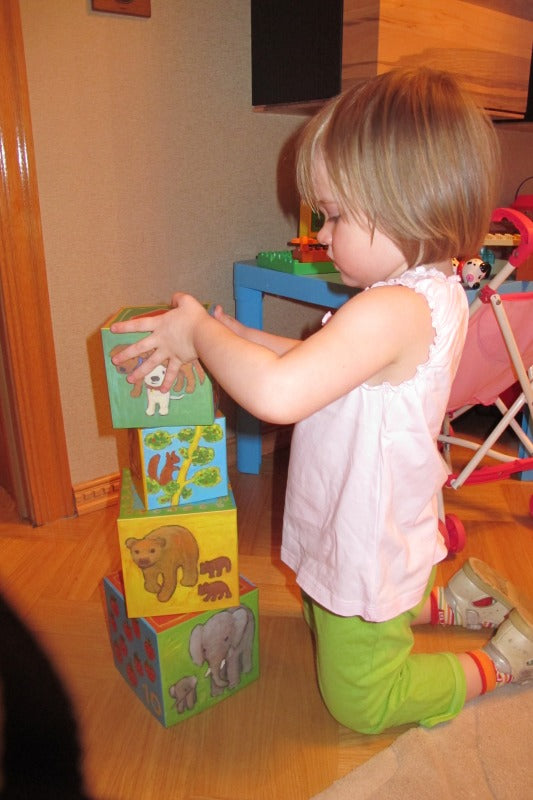 Όταν το μωρό είναι περίπου ενός έτους θα διαλύει όλο υπερηφάνεια τους χάρτινους κύβους και θα είναι μέρος του παιχνιδιού του μαζί σας. Με τον καιρό θα τοποθετήσει το ένα κυβάκι μέσα στο άλλο, πλάι στο άλλο και το ζωάκι από πάνω και σιγά σιγά θα κάνει ολόκληρα κατασκευή.