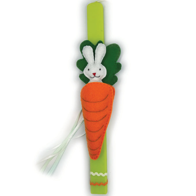 Η Λαμπάδα Λαγουδάκι είναι χειροποίητη και το σχέδιο είναι κατασκευασμένο από φετρίνα με πολλή προσοχή και λεπτομέρεια.