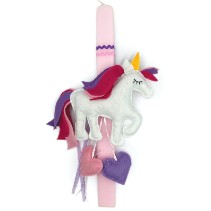 Η Λαμπάδα Μονόκερος με Καρδιές είναι χειροποίητη και το σχέδιο είναι κατασκευασμένο από φετρίνα με πολλή προσοχή και λεπτομέρεια.